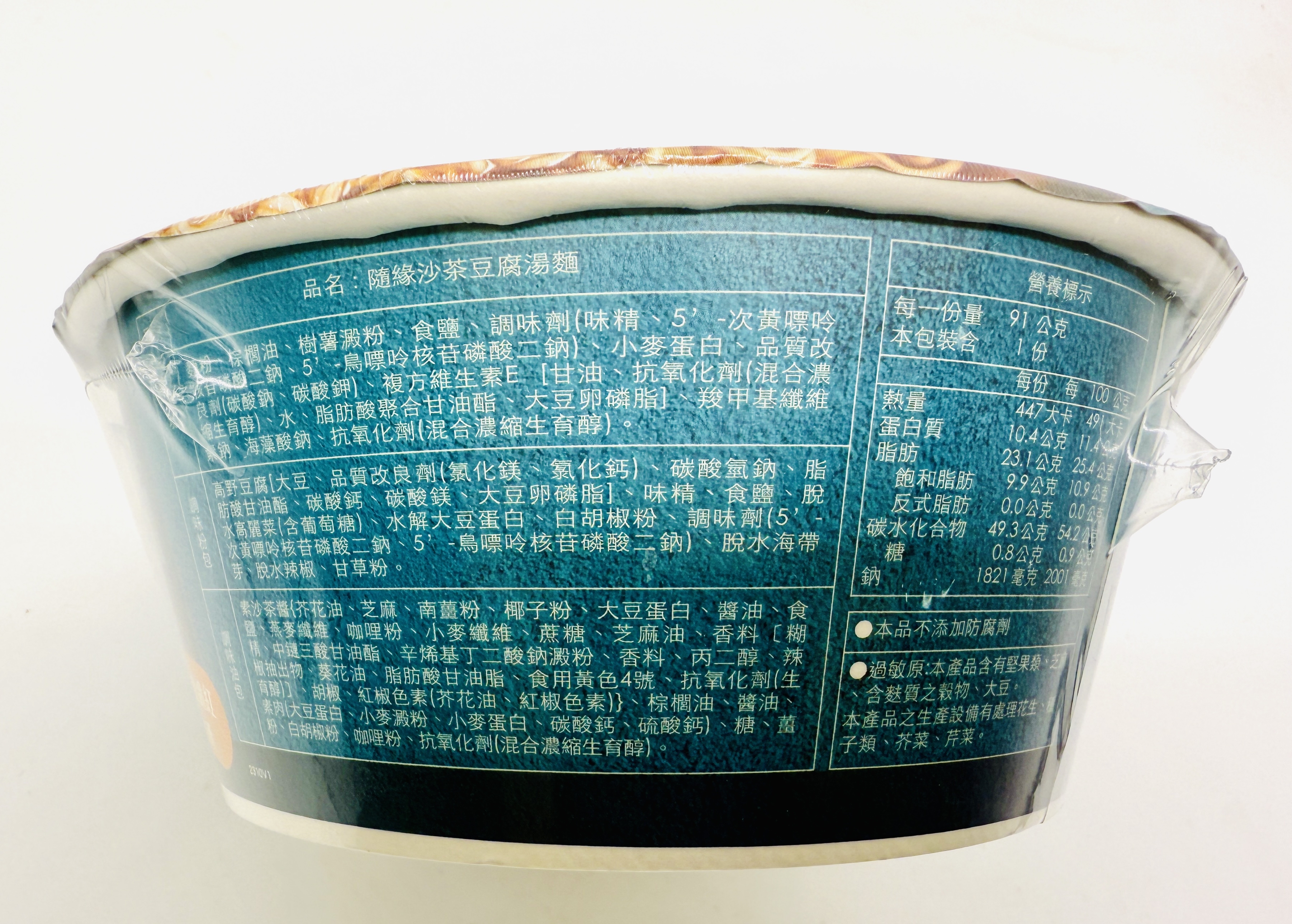 重量 : 91g 產品特色 醬香濃郁的沙茶湯底 沙茶濃厚、香氣十足,醬香中還帶點鮮甜味, 口味厚實不膩口, Q彈麵條意猶未盡 選用好入口細麵,感受到融合醬汁的風味以及Q彈的麵條口感,緊密吸附湯汁,整碗超對味! 添加大量豆腐塊及蔬菜,口感超豐富 特選大量豆腐塊,如海綿般的吸飽濃厚湯汁, 超有咬勁, 添加高麗菜、海帶芽、辣椒圈,口感層次超迷人!!