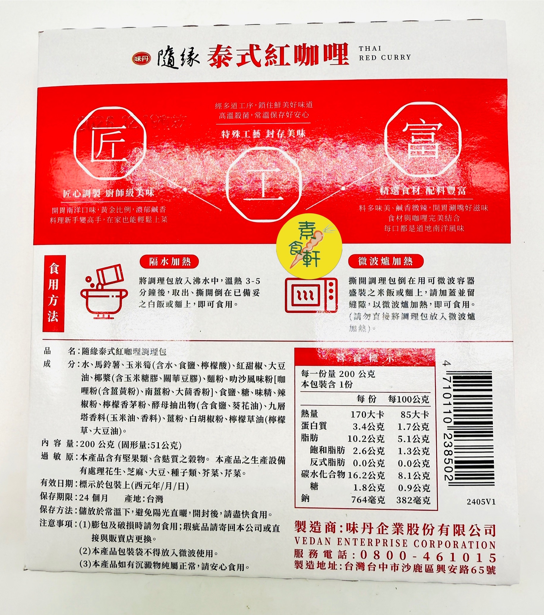 規格:200公克 產品特色: 精選十多種南洋辛香料提香拌炒, 以馬鈴薯、紅彩椒、玉米筍點綴於其中, 完美比例調製道地泰式紅咖哩,口感溫順,辣而不過於刺激。 輕鬆料理 還原美味 南洋特色名菜口味 通過潔淨標章認證 全素配方,茹素者可安心食用