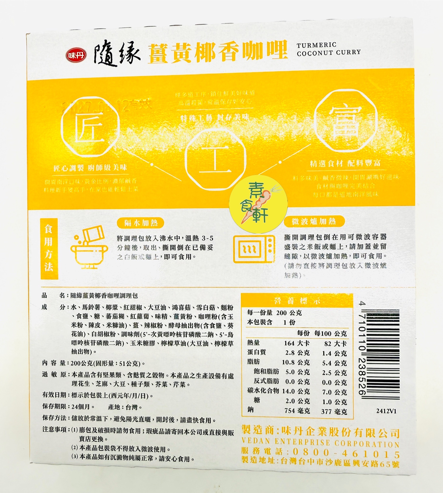 規格:200公克 產品特色: 使用濃郁椰奶為基底,搭配多種南洋風味靈魂元素, 以馬鈴薯、彩椒、蕈菇點綴於其中 混薑黃、南薑等辛香料燉煮醬汁,帶出黃金比例的濃郁香氣。 輕鬆料理 還原美味 南洋特色名菜口味 通過潔淨標章認證 全素配方,茹素者可安心食用
