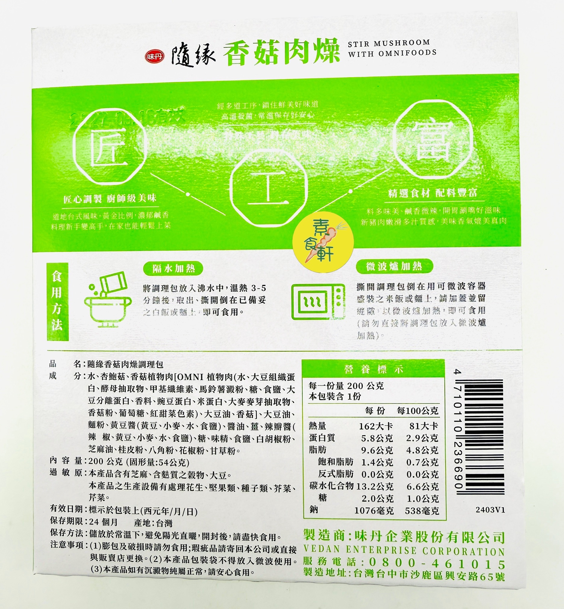 規格:200公克 產品特色: 特選八角、油桂及花椒大火快炒爆香, 媲美真肉質感的新豬肉與新鮮香菇,拌炒後香氣四溢, 形成一道料多味美、濃郁鹹甜的經典料理。 輕鬆料理 還原美味 台式傳統經典口味 使用OMNI植物肉、通過潔淨標章認證 全素配方,茹素者可安心食用