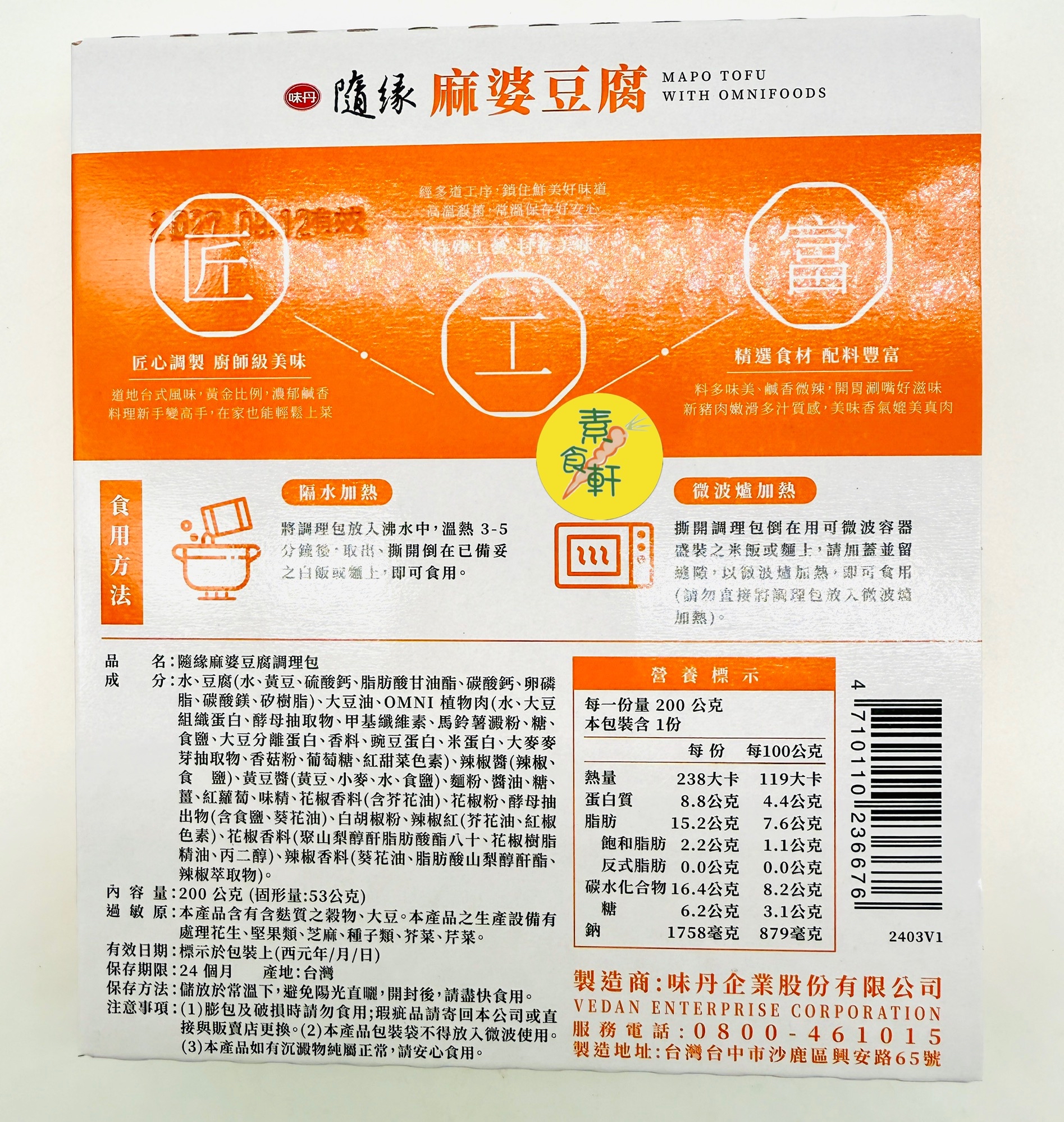 產品特色: 精選道地花椒下鍋爆炒後辛香味層次十足。 鮮嫩豆腐吸飽特調麻婆醬汁,香辣有勁、椒香四溢, 入口麻而不苦、辣味馥郁,香氣十足。 輕鬆料理 還原美味 台式傳統經典口味 使用OMNI植物肉、通過潔淨標章認證 全素配方,茹素者可安心食用